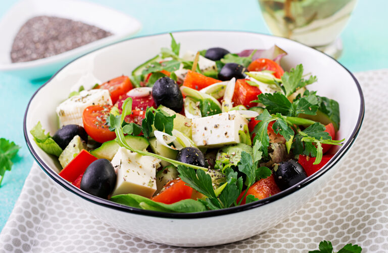 ENSALADA GRIEGA CON QUESO FETA, TOMATE Y ACEITUNAS NEGRAS
