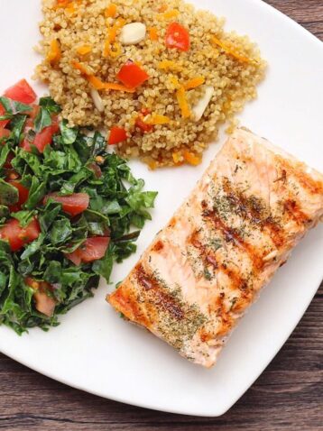 Ingredientes: Para el salmón: Para la ensalada de kale: Para la quinoa con verduras: Preparación paso a paso: 1. Cocina la quinoa: 2. Saltea las verduritas: 3. Prepara el salmón: 4. Masajea el kale: Recomendación: …
